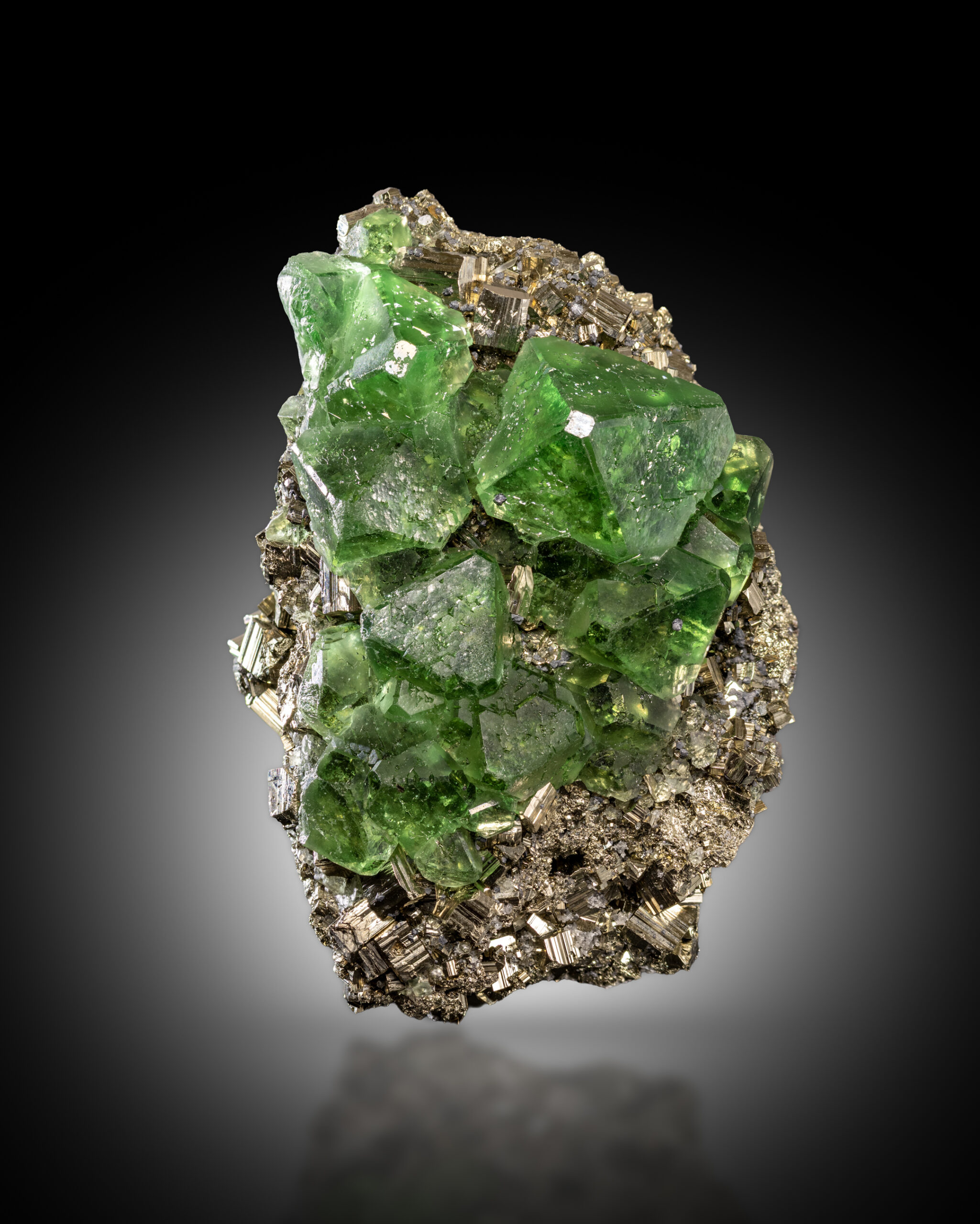 Stunning fluorite with truncated octahedron crystals. This exceptional specimen features vivid, translucent lime-green fluorite crystals sitting on shiny pyrite matrix. The contrast between the vibrant green fluorite and the metallic gold of the pyrite creates an eye-catching visual harmony that’s highly sought after by collectors.