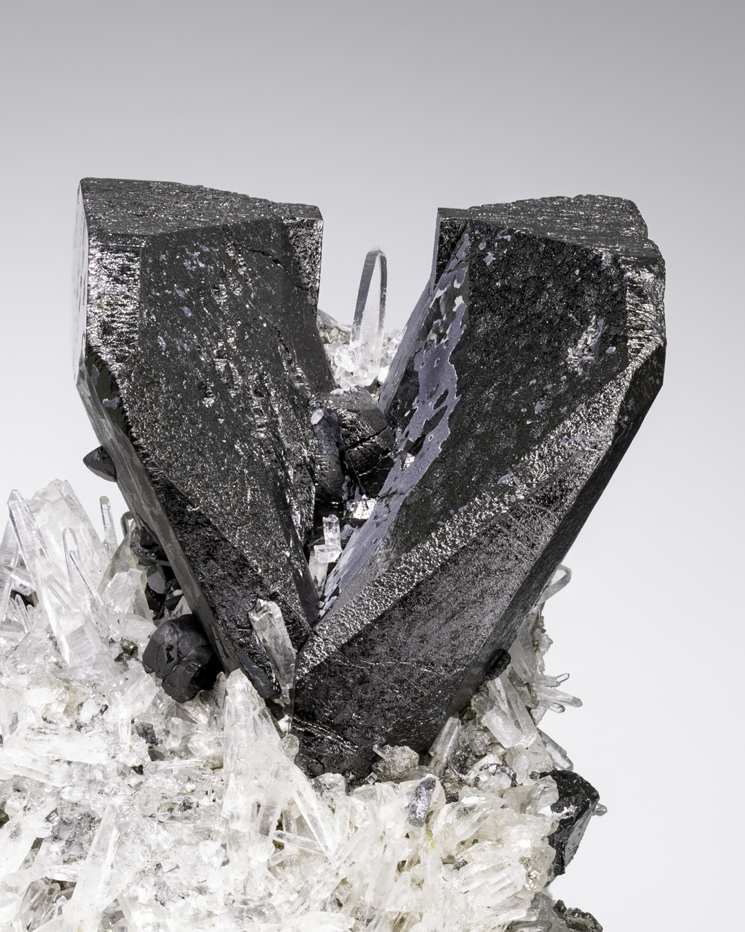 A superb example of classic Bolivian Ferberite, featuring a striking V-twinned crystal pair with sharp, lustrous faces and deep metallic black reflections. The twin rises majestically from a matrix richly covered with delicate, transparent Quartz crystals, creating a beautiful contrast between light and dark.