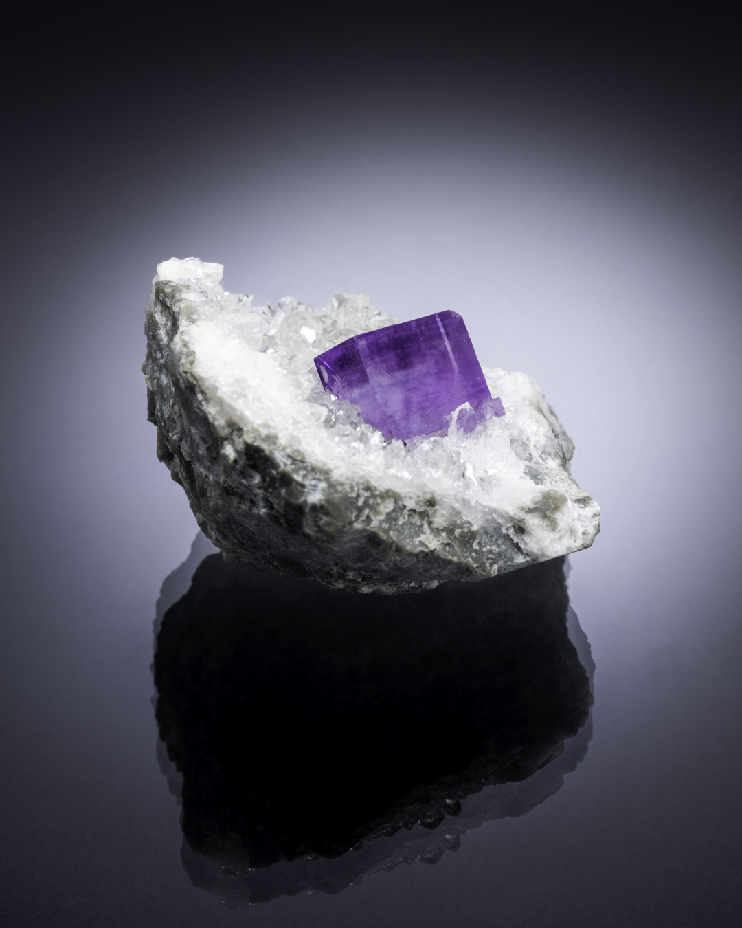 Attractive fluorite from the classic locality of Berbes, featuring a well-formed purple cubic crystal beautifully set on a sparkling white quartz matrix. The crystal shows rich color saturation and clean geometry, creating a strong and balanced visual contrast.